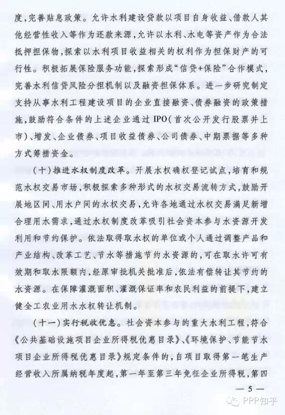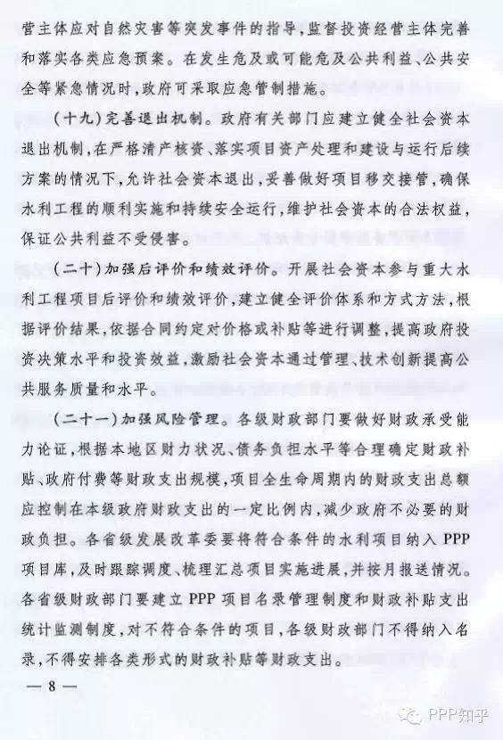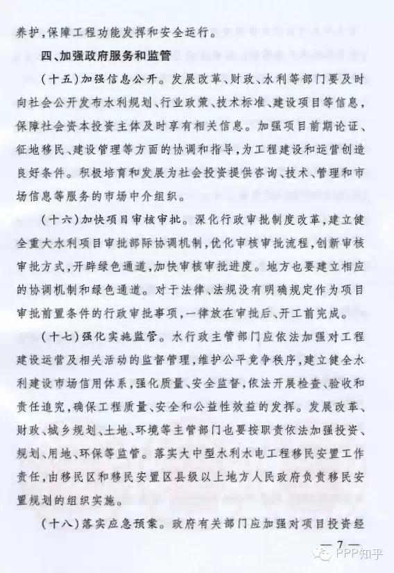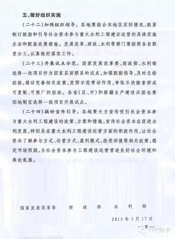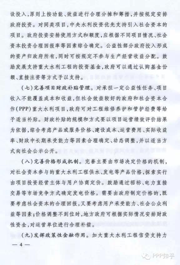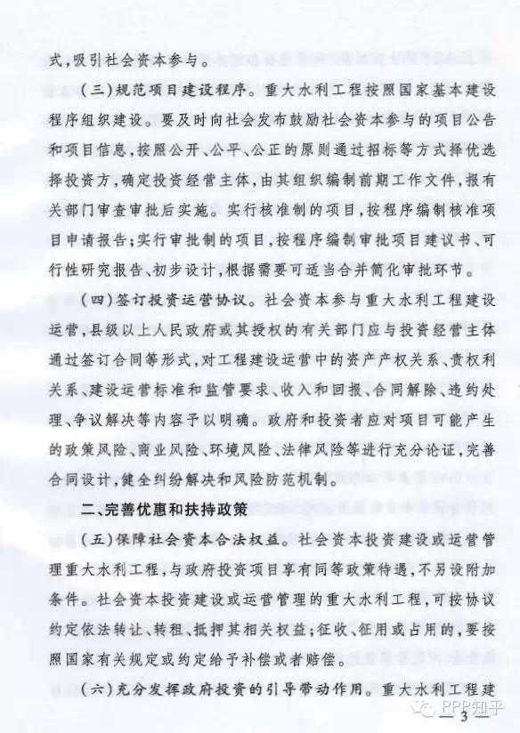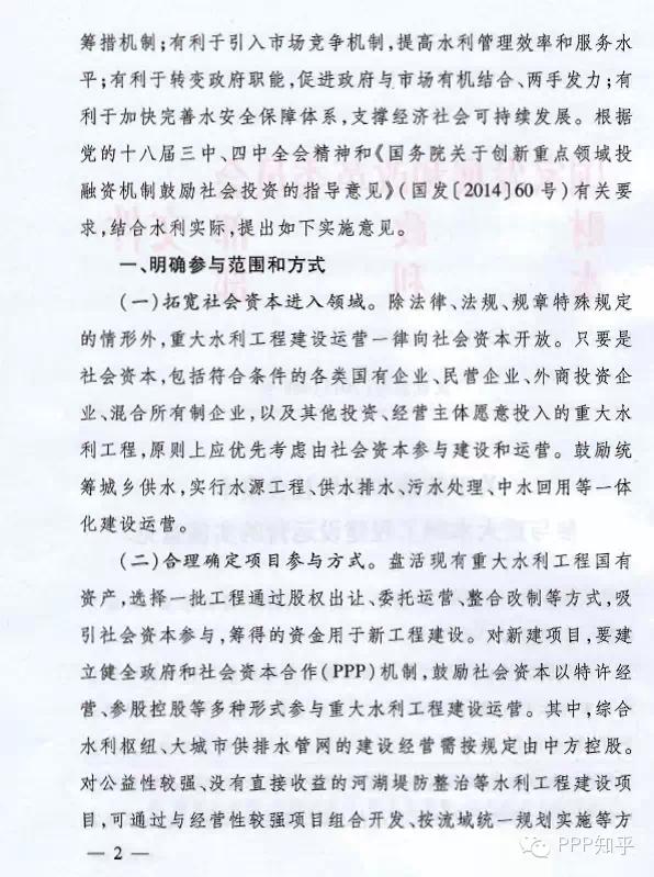 为贯彻落实党的十八届三中、四中全会精神和《国务关于创新重点领域投融资机制鼓励社会投资的指导意见》(国发[2014]60号)有关要求,进一步拓宽水利投融资渠道,加快重大水利工程建设,提高水利管理效率和服务水平,完善国家水安全保障体系,近日,国家发展改革委、财政部、水利部联合出台了《关于鼓励和引导社会资本参与重大水利工程建设运营的实施意见》,通过政府投资引导、财政补贴、价格机制、金融支持等政策措施,鼓励和引导社会资本投入参与重大水利工程建设运营,并将推出一批吸引社会资本参与的试点项目,探索政府与社会资本合作(PPP)的机制。