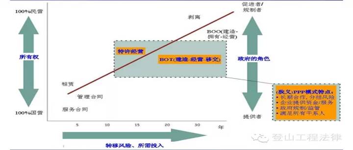 图1则大概表示了狭义PPP(蓝底框内部分)和广义PPP(框内和框外部分,其中框外左下角更偏外包,右上角则有私有化的意思)的框架和要素(所有权、政府角色、风险转移)和狭义PPP 的特点。