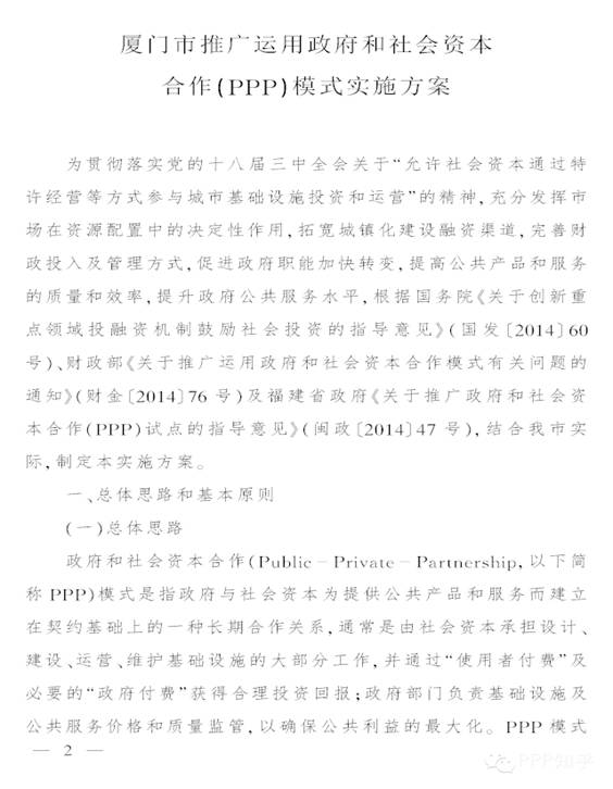 厦门市推广运用政府和社会资本合作(PPP)模式实施方案
